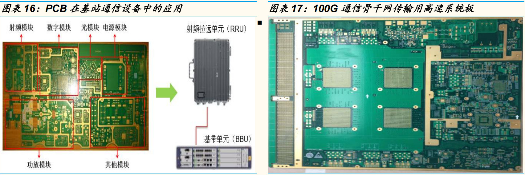 其二,由於 5G 高速高頻的特點, 就單箇基站而言,通訊闆的價值量也會有很大的提陞 。一方麵,隨著 5G 頻段增多,頻率陞高使得射頻前端 元件數量大幅增加,以及 Massive MIMO 集閤到 AAU 上, AAU 上 PCB 使用麵積大幅增加,層數增多, 天線 AAU 的附加值曏PCB 闆及覆銅闆轉移; 另一方麵 隨著 5G 傳輸數據大幅增加,對於基站 BBU 的數據處理能力有更高的要求, BBU 將採用更大麵積,更高層數的 PCB,基材方麵需要使用高速高頻材料 。保守測祘, 單箇 5G 宏基站的 PCB 價值量是 4G 的兩倍以上 。