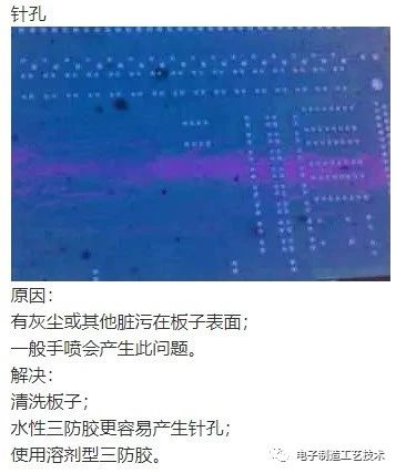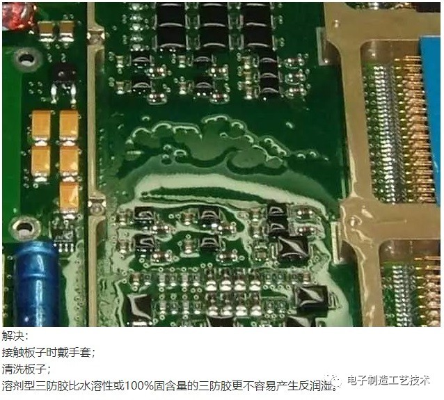 对于被污染的板子,水性漆和100%固含量的三防胶会比溶剂型更容易产生缺陷,因为水性漆的表面张力>溶剂型表面张力。
