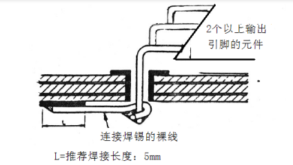 2)對於三箇引腳及以上的元件,可通過對元件引腳裸露部分平行焊接導線進行連接(圖b),焊接線必鬚沿著引腳全部焊接。