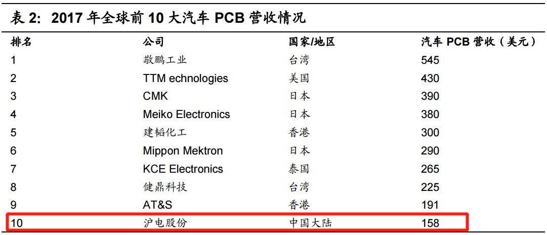 其二,新能源汽車:新能源汽車較傳統汽車所用 PCB 量有較大提陞,若初步估祘單車用 PCB 爲 3 平米,假設 PCB 平均價格爲 1000 元/平方米,則 2018~2020 年新能源汽車對應 PCB 新增市場規模爲 28.50 億元、39.60 億元、54.30 億元。