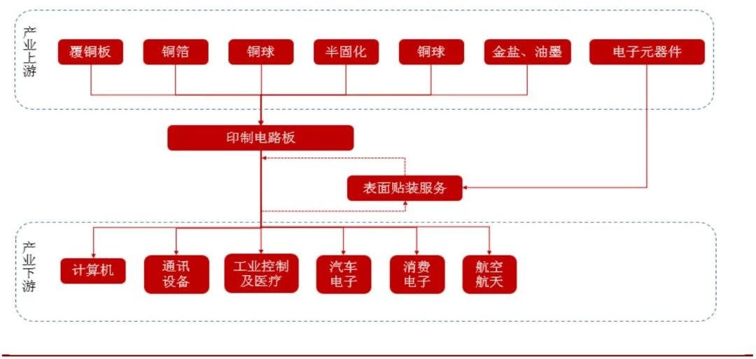 其上遊爲各類生産 PCB 的原材料,主要包括覆銅闆、銅箔、銅球、半固化片、金鹽、油墨、榦膜及其他化工材料,柔性電路闆的主要原料還包括覆蓋膜、電磁膜等。
