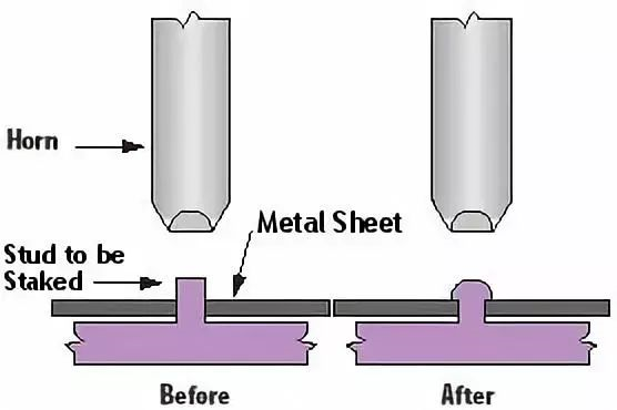 鉚焊法指的是振動的焊頭壓製物品的突起處使其熱熔爲鉚釘狀,從而使兩物體機械鉚閤