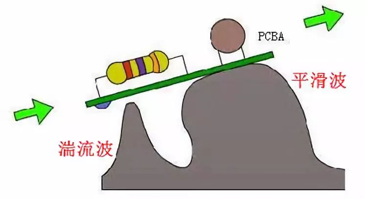 波峰焊是採用對流傳熱原理對焊區進行加熱的。熔融的焊料波作爲熱源,一方麵流動以衝刷引腳焊區,另一方麵也起到瞭熱傳導作用,引腳焊區正是在此作用下加熱的。爲瞭保證焊區陞溫,焊料波通常具有一定的寬度,這樣,當組件焊接麵通過波時就有充分的加熱、潤濕等時間。傳統的波峰焊中,一般採用單波,而且波比較平坦。隨著鉛焊料的使用,目前多採取雙波形式。如下圖所示