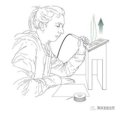 在圖1中,工件已經被抬高至能夠使員工焊錫時不會吸入煙氣。如果你不使用鬆香助焊劑或其他産生有害煙氣的助焊劑,操作者註意操作姿勢和足夠的通風,便足以應對小規模、小頻率的焊錫工作瞭。在大多數情況下,焊錫要求使用局部通風。當局部排風進行正確設計、正常運行併被被正確的使用,局部通風可以很好地控製焊錫煙氣。
