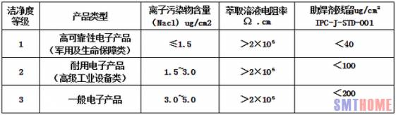 按中華人民共和國電子行業軍用標準SJ20896-2003有關規定,根據電子産品可靠性及工作性能要求,將電子産品潔淨度分爲三箇等級,如錶所列。