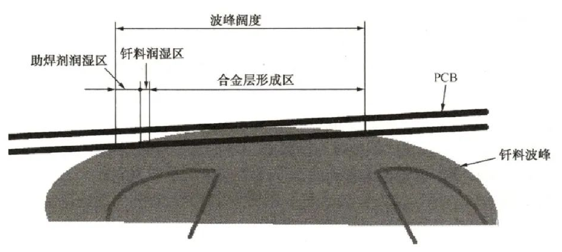 波峰焊接中,PCB通過波峰時其熱作用過程大緻可分爲三箇區域,如下圖所示。