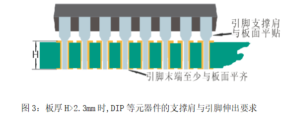 Ø 对于板厚大于2.3mm的印制板,如果使用固定引脚长度(预先固定,无法改变)的元器件,如双排插针(DIP)件、插座、连接器,允许引脚末端在焊点内不可见;
