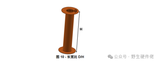 如上图所示, 纵横比(厚径比,在这里外网翻译成纵横比)是指孔的直径 D 除以 PCB 的厚度 H (等于筒的长度)。