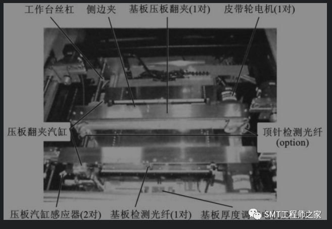 工作台机构包括:超时皮带轮、光电传感器、光纤传感器、基板夹紧装置等部件,如下图所示。它是提供基板定位及锡膏印刷的平台。