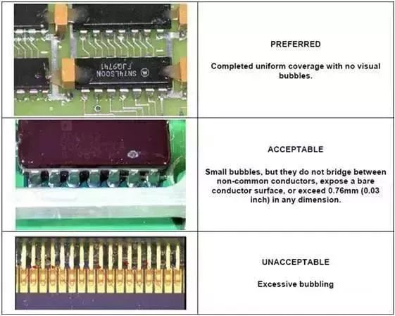 溶剂型的三防漆出现大气泡,主要是由于炉温太高¬,表层快速结皮,太多的溶剂留在漆膜中,表层之下的溶剂快速挥发导致,或是三防漆黏度过高,厚度过厚,气泡无法迅速释放。出现这种大气泡解决的办法是:优化炉温曲线,降低炉温曲线爬坡坡度;增加固化前流平溶剂挥发量,如增加烘烤前自干的时间;涂覆时减小胶量,如减少重叠涂覆区域。