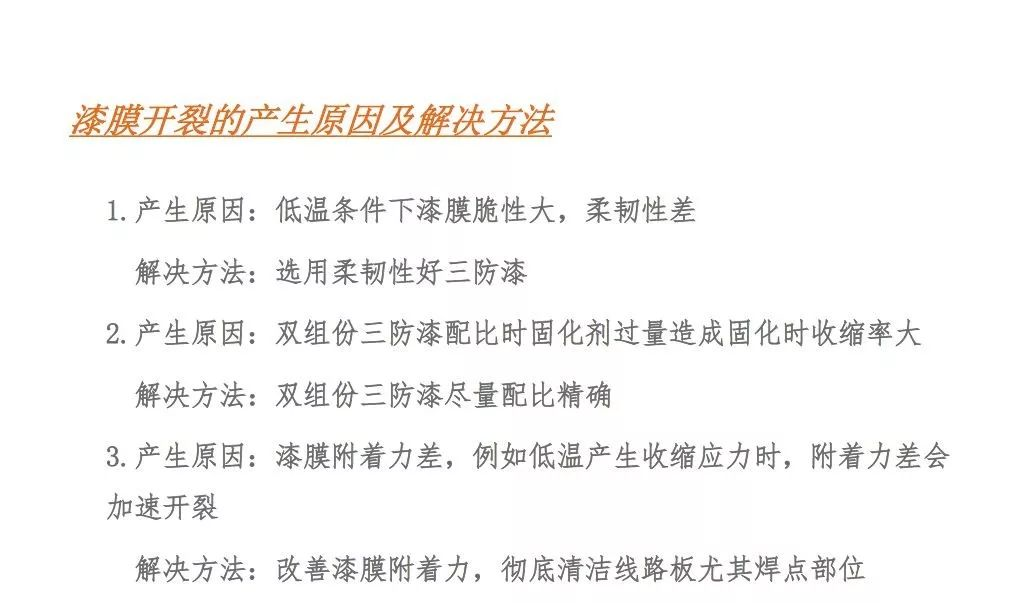 解决的办法主要是检查生产环境,如温湿度;减小固化前流平挥发区域的排放量;降低三防漆粘度;减小炉温曲线爬坡坡度;使用挥发速度较慢的稀释剂。