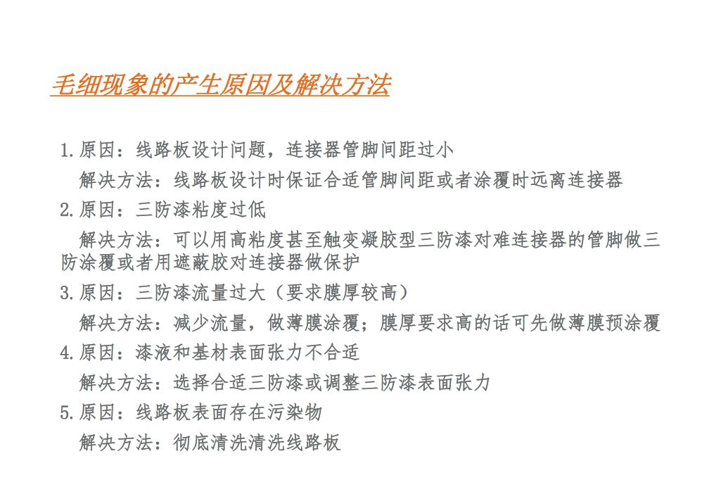 解决的办法是:1涂覆区域与连接器距离增加;2在连接器周围使用遮蔽胶形成围栏;3使用黏度更高的三防漆;4降低膜厚;5清洗板子