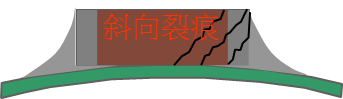 b. 斜向裂痕:由于弯折的应力在零件下部形成支点,固定的焊点在电极端头产生断裂的斜面现象,尤其是与应力方向垂直的大尺寸元件断裂最为严重。