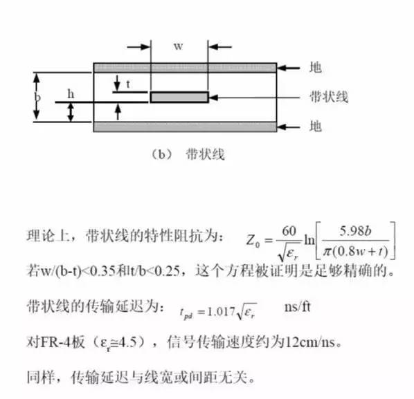带状线是一条置于两层导电平面之间的电介质中间的铜带线。如果线的厚度和宽度、介质的介电常数以及两层导电平面间的距离是可控的,那么线的特性阻抗也是可控的,带状线的特性阻抗为:
