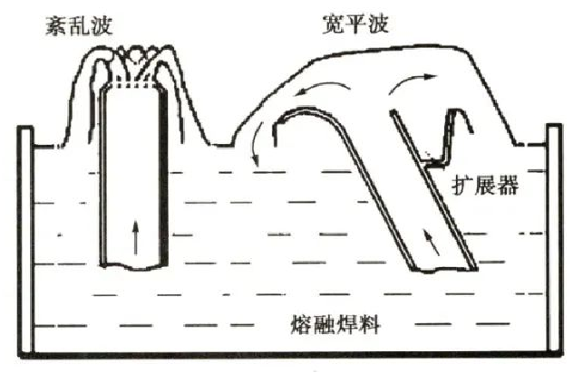 . 如下圖所示,在焊料的噴嘴齣口處安裝瞭擴展器,熔融的鉛錫熔液從傾斜的噴嘴噴流齣來,形成偏曏寬平波(也叫片波)。逆著印製闆前進方曏的寬平波的流速較大,對電路闆有很好的擦遊作用:在設置擴展器的一側,熔液的波麵寬而平,流速較小使焊接對象叮以穫得較好的後熱效應,起到修整焊接麵、消除橋接和拉尖、豐滿焊點輪廓的效果。