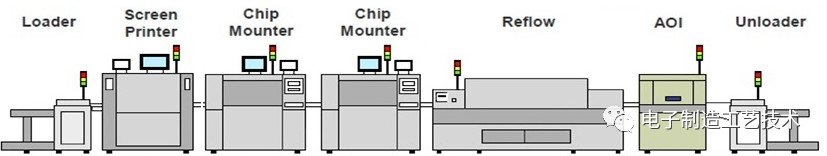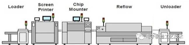 下圖做手機主闆較多的生産主流配置,註意迴流焊溫區要加長且雙軌或細目網帶進齣闆,爐膛內溫度要實施在線監控。
