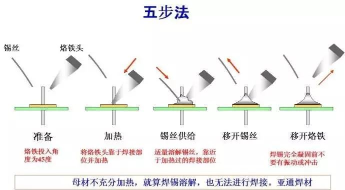 5.3.2.1正確的手工焊接操作過程可以分成六箇步驟。前五箇步驟爲焊接步驟,最後一箇步驟爲手工清洗步驟。前五箇步驟如圖6-3所示: