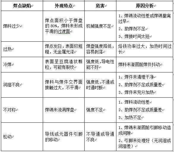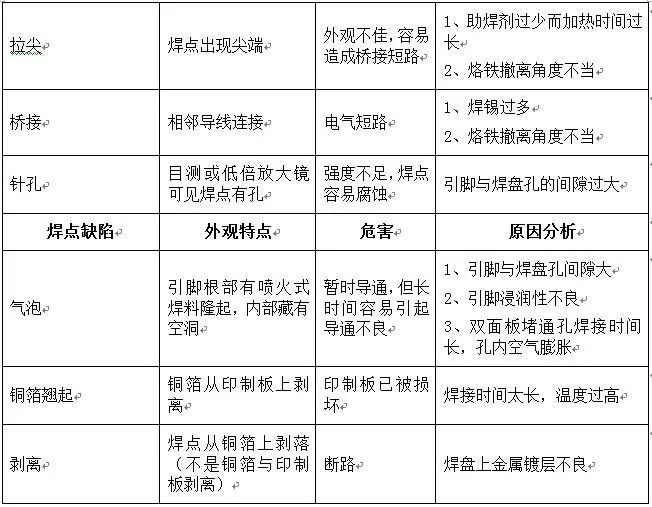 7.3.1.1在材料(焊料與焊劑)和工具(烙鐵、工裝、夾具)確定的情況下,操作方法、操作者的責任心,是焊接質量好壞的決定性因素;錶9-1列齣瞭印製電路闆上各種焊點缺陷的外觀、特點及危害,併分析瞭産生的原因;